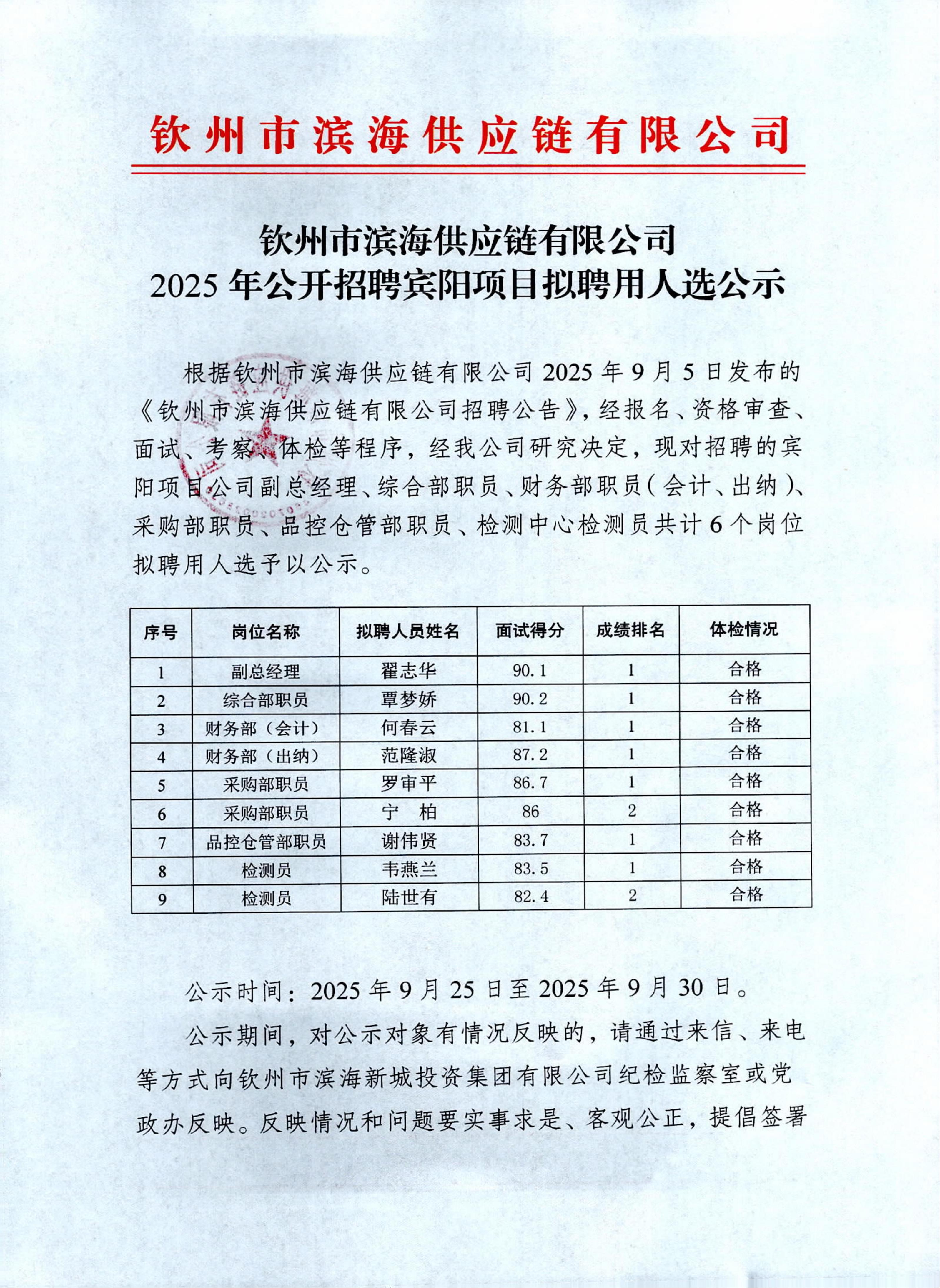 欽州市濱海供應(yīng)鏈有限公司2025年公開招聘賓陽(yáng)項(xiàng)目擬聘用人選公示2025-09-24
