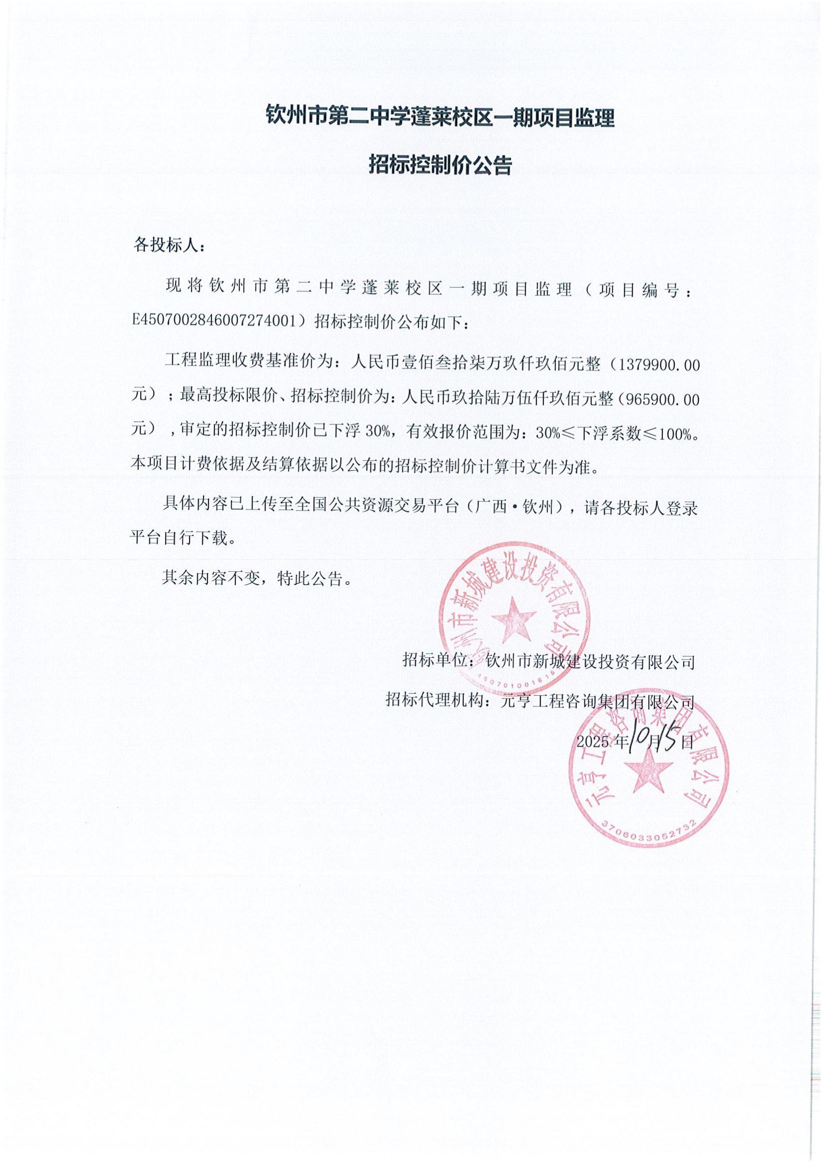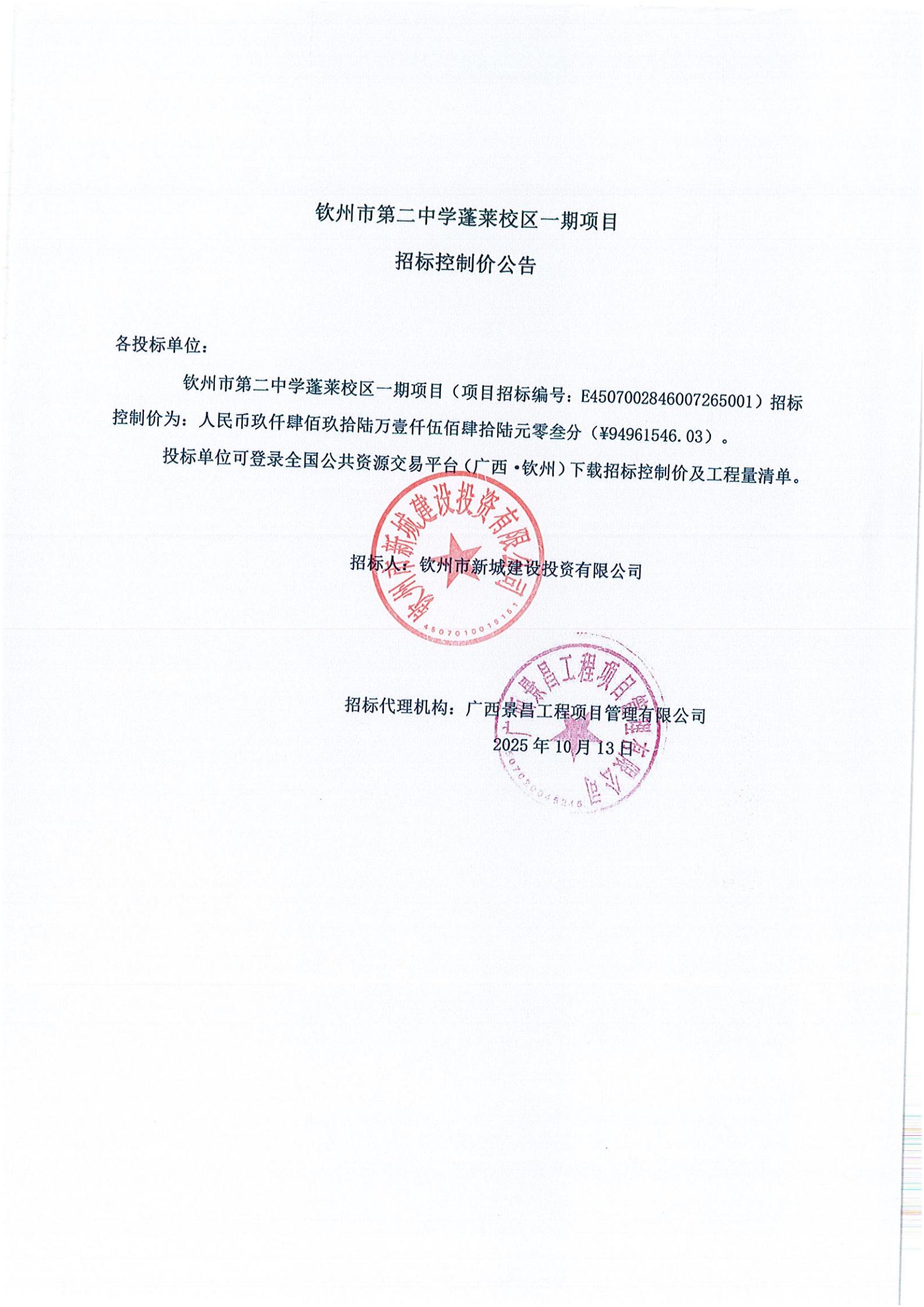 欽州市第二中學蓬萊校區(qū)一期項目招標控制價公告