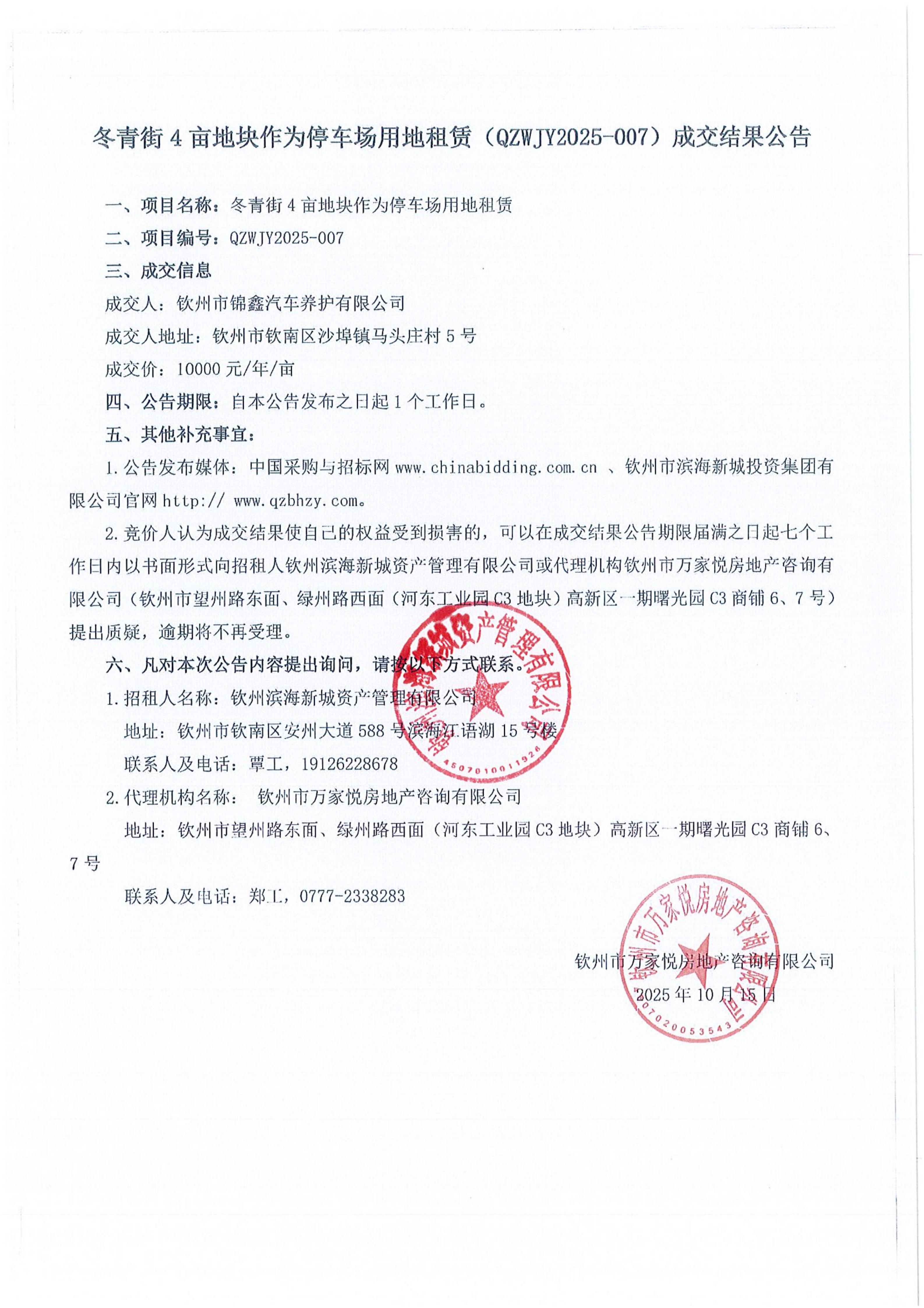 冬青街4畝地塊作為停車場用地租賃(QZWJY2025-007)成交結(jié)果...