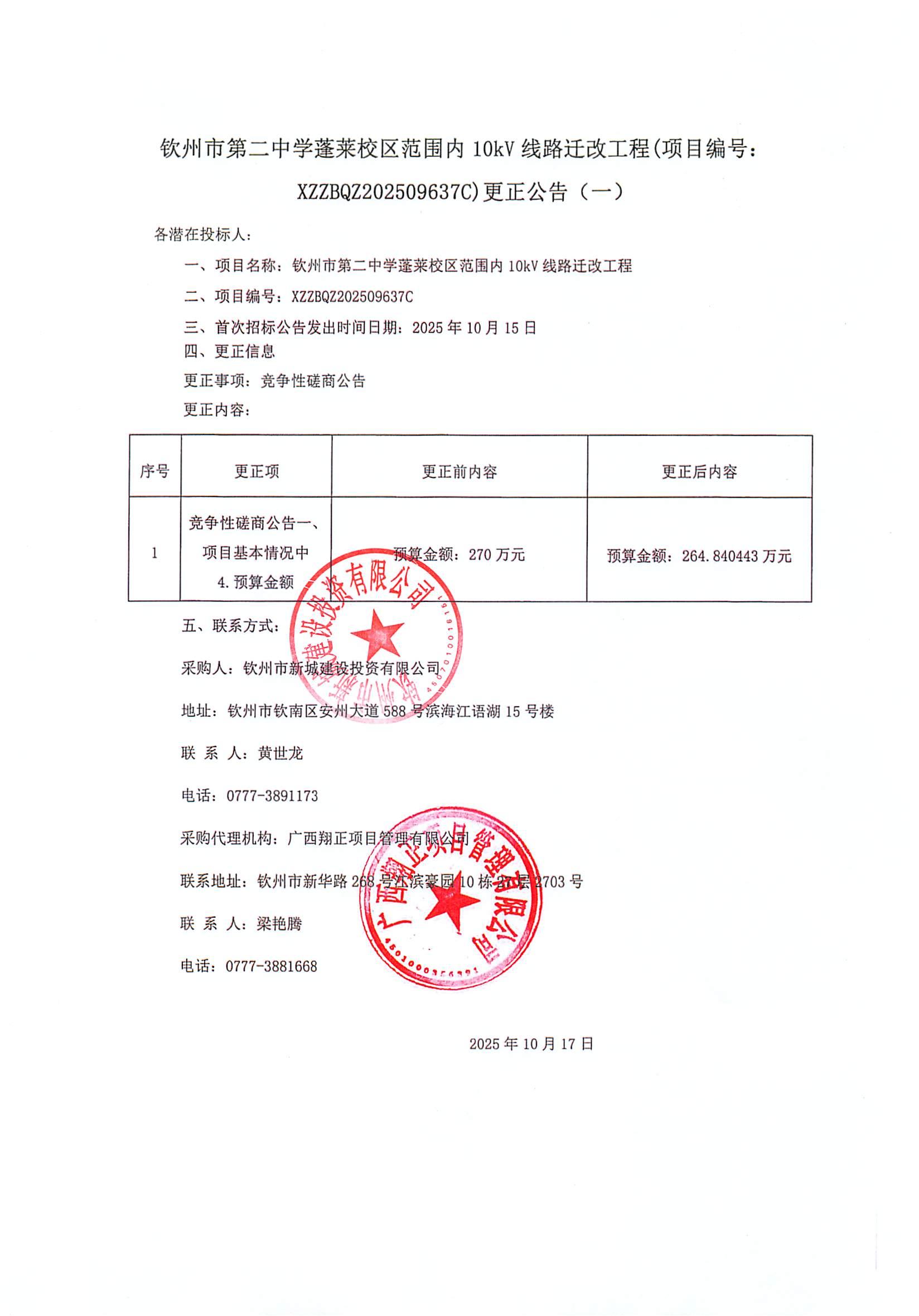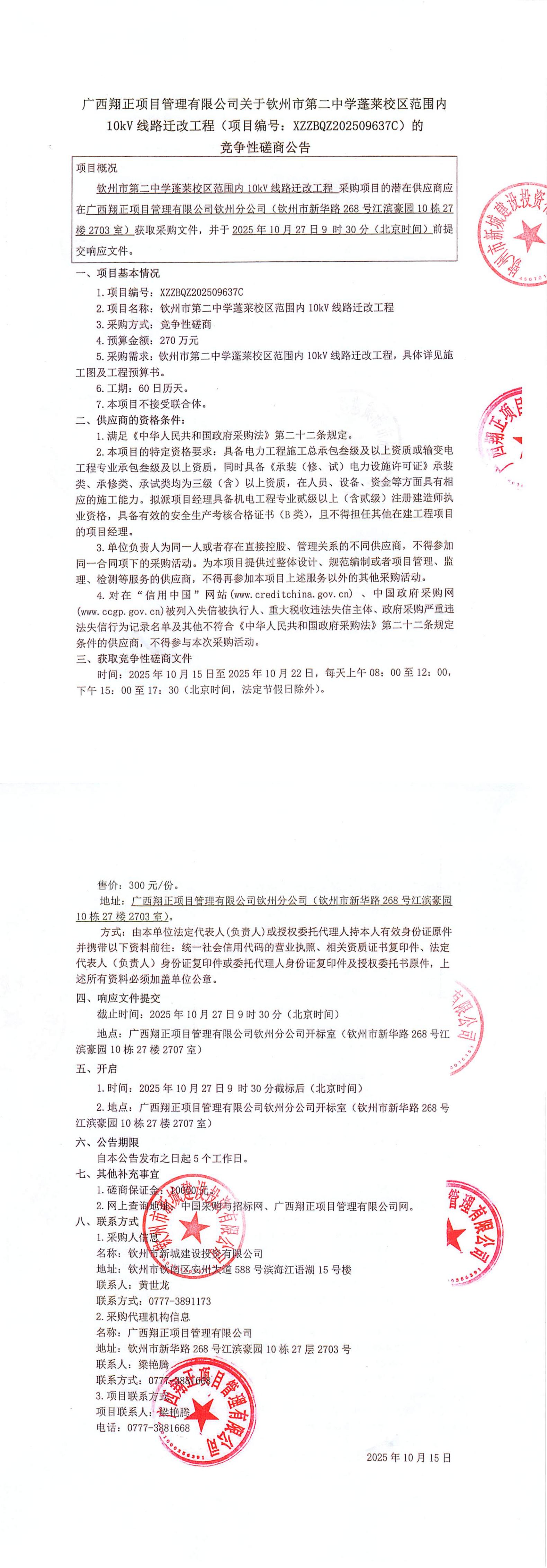 廣西翔正項目管理有限公司關(guān)于欽州市第二中學蓬萊校區(qū)范圍內(nèi)10kV線路遷...