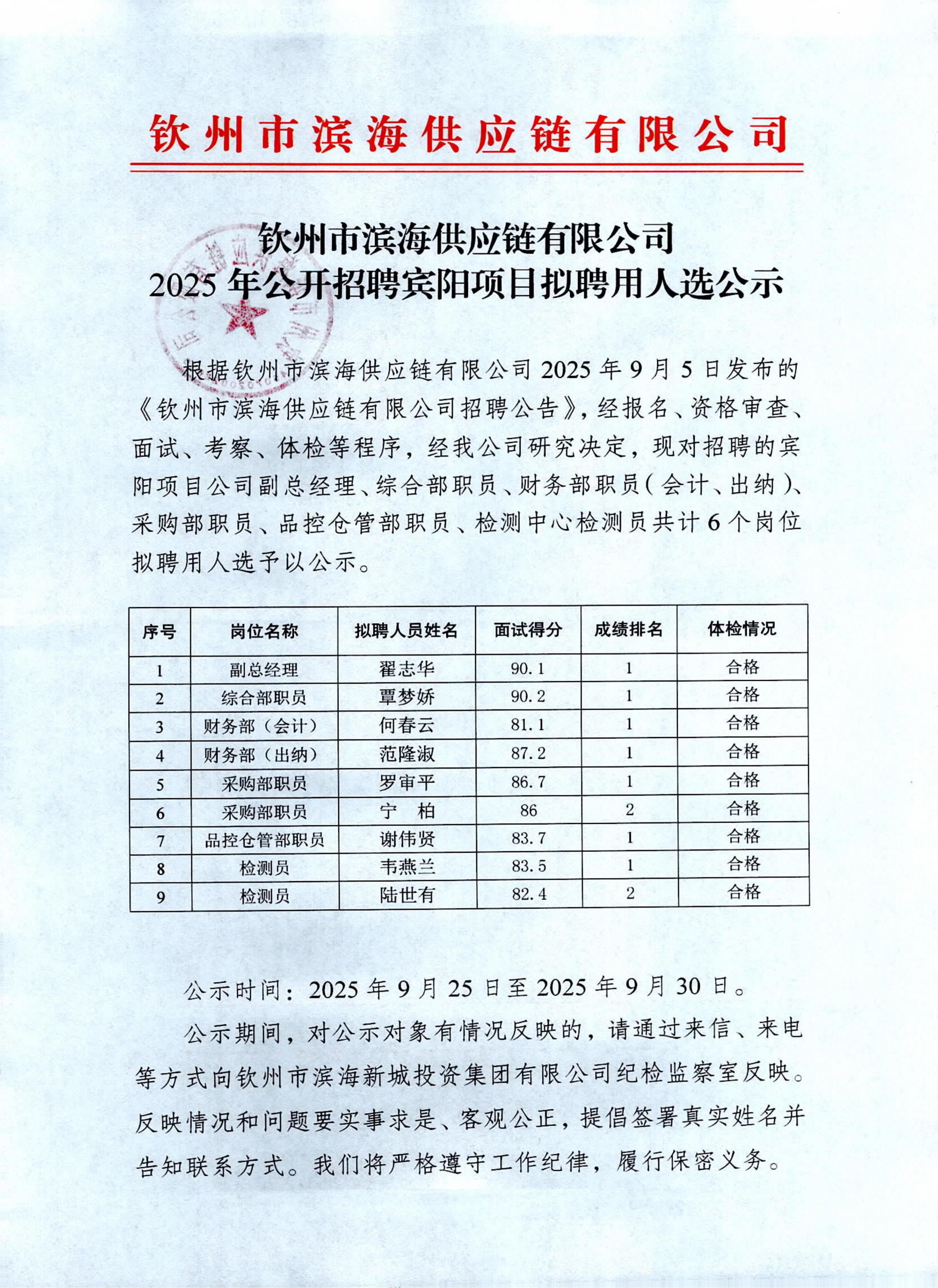 欽州市濱海供應(yīng)鏈有限公司2025年公開招聘賓陽項目擬聘用人選公示