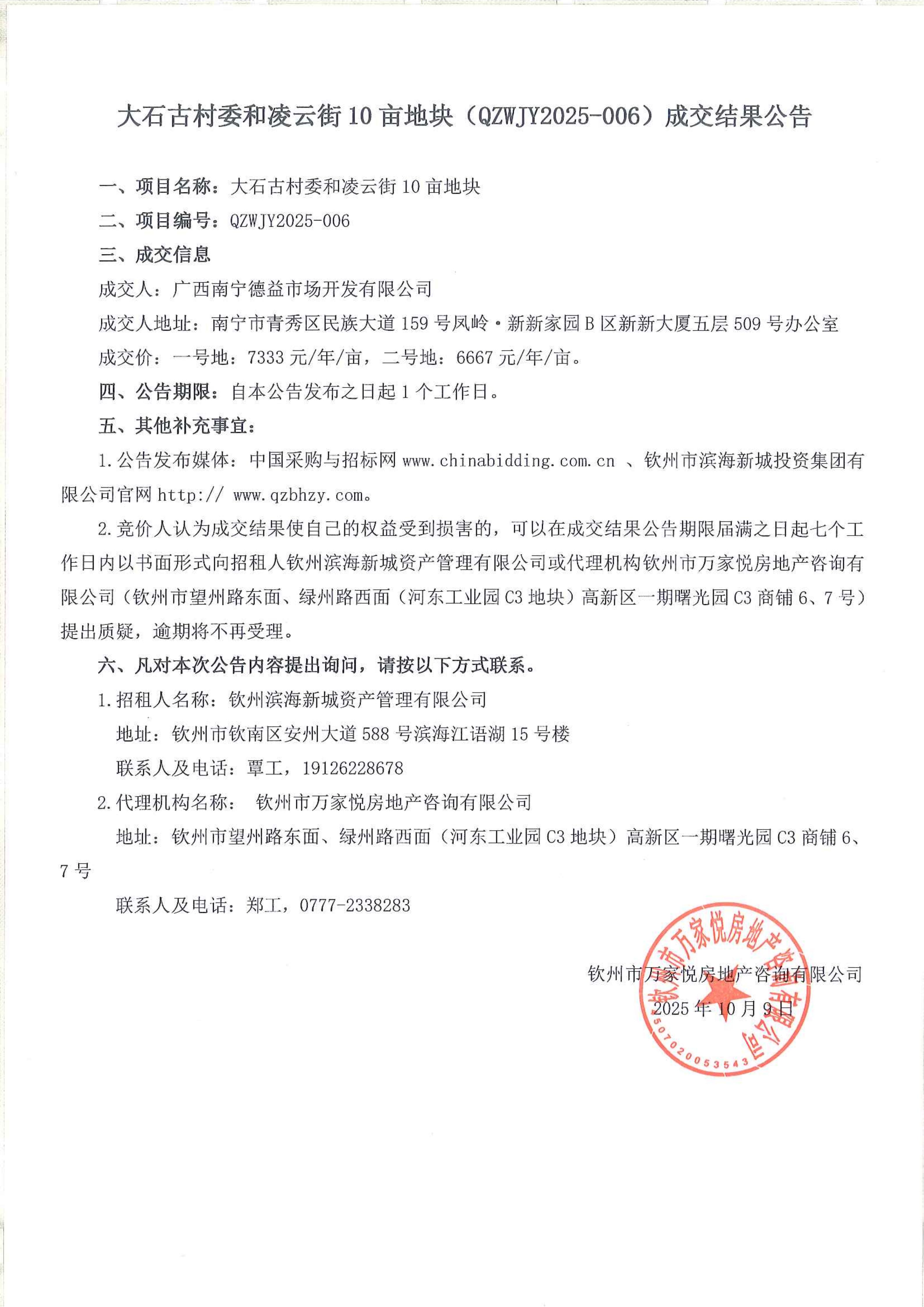 大石古村委和凌云街10畝地塊(QZWJY2025-006)成交結(jié)果公告